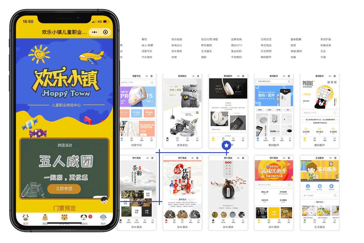 餐饮、综合电商、知识付费/课程、品牌官网、日用百货、服装鞋帽、美容护肤、生鲜蔬果、家电办公、鲜花植物、酒店/KTV、珠宝饰品、旅游、机械设备、教育培训、母婴专区、茶叶酒类、生活服务